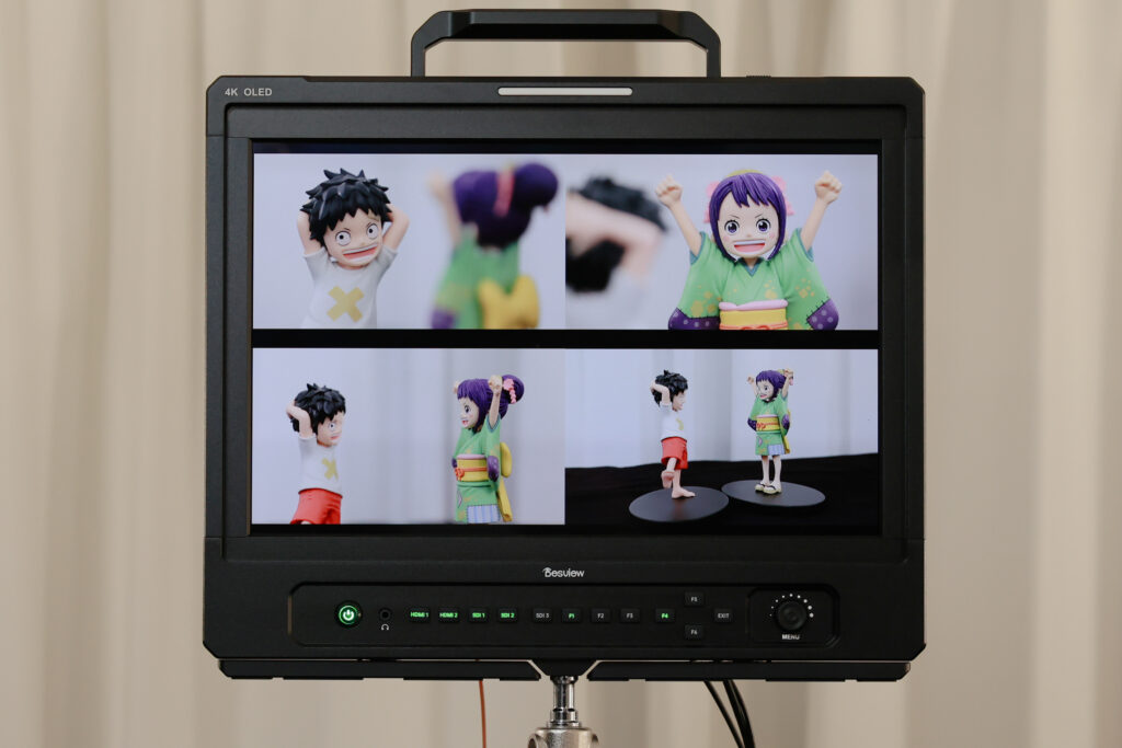 バッテリー駆動の大型有機ELモニターにロケなどでの移動が自由で8インチ前後の3カメ映像をワイヤレスで同一表示可能、1500nitと高輝度なため野外での視認性にも非常に優れています。縦位置、横位置など即座に切り替えられるようフレキシブルVESAマウントに交換済み。